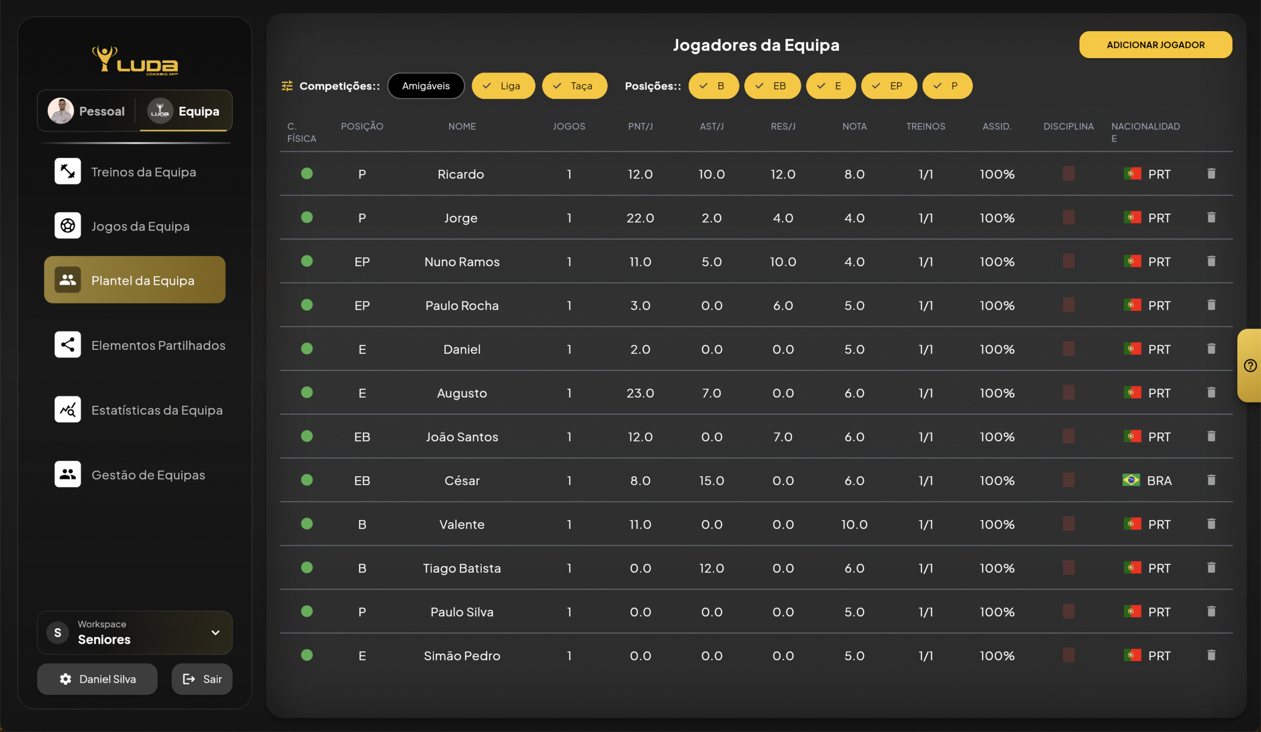 Define permissões nos diferentes escalões, acompanhando o progresso de cada equipa e atleta com dados detalhados.