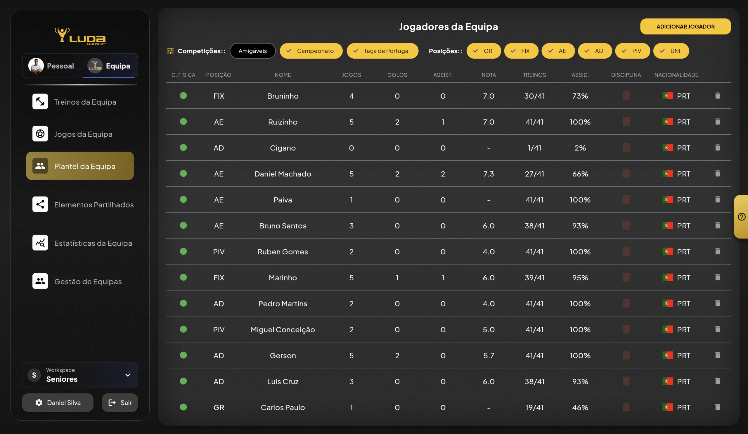Cada jogador tem uma ficha completa: dados pessoais, características, estatísticas, histórico de lesões, etc